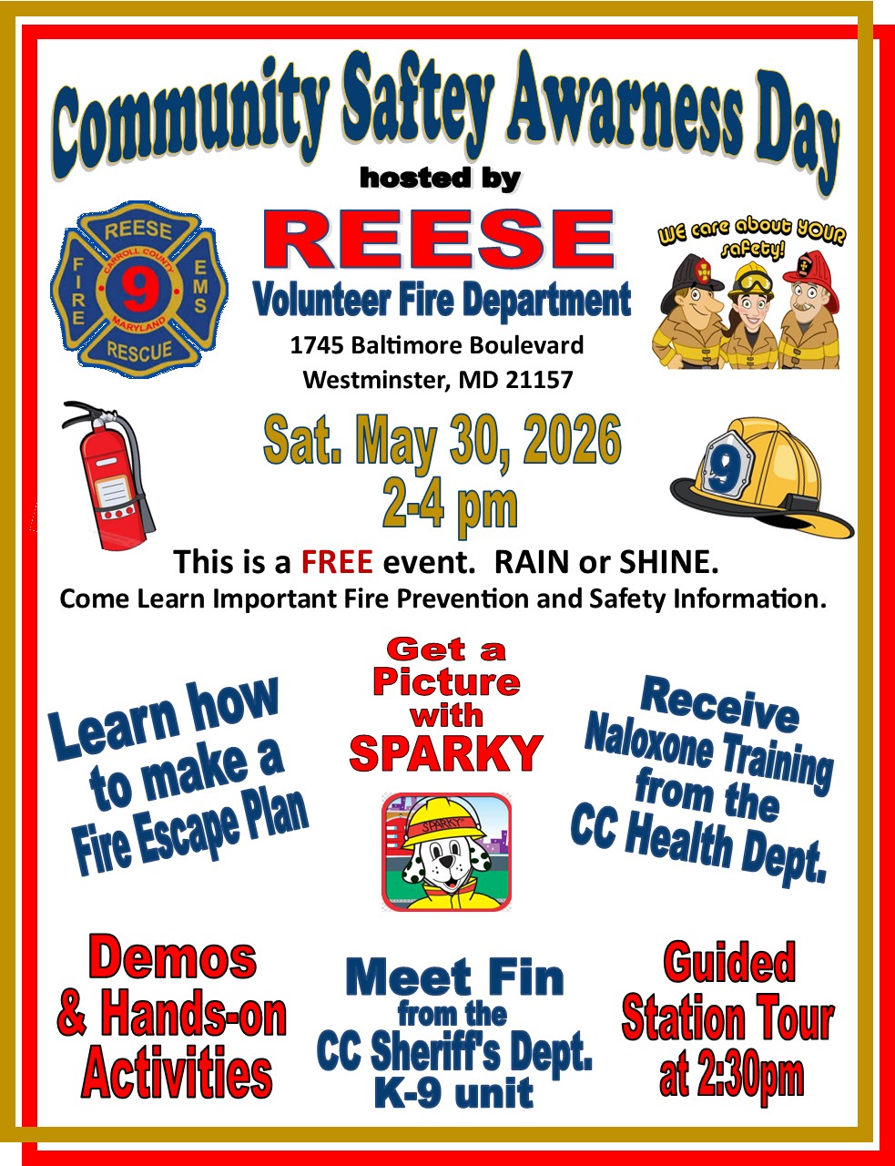 Want a Reese & Community Volunteer Fire Company Patch to add to your collection? Send $5.00 and a Self Address Stamped Envelope to Reese & Community Volunteer Fire Company c/o Kati Townsley 1745 Baltimore Blvd. Westminster, Maryland 21157 or email us for questions or more information.