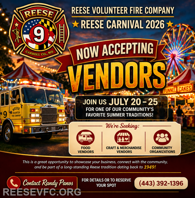 | The Reese Volunteer Fire Company is excited to announce that we are now accepting vendor applications for our upcoming 2026 Reese Carnival, taking place July 20–25.