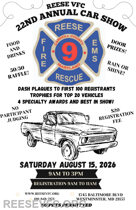 Date: Saturday, August 15, 2026 π Show Hours: 9:00 AM β 3:00 PM π Registration: 9:00 AM β 11:00 AM π Location: Reese & Community Volunteer Fire Company 1745 Baltimore Blvd Westminster, MD 21157